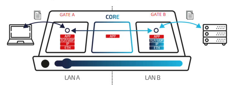 Toàn bộ 3 thành phần này lắp đặt riêng biệt. Mỗi thành phần được cấu tạo gồm CPU và FPGA - Field Programmable Gate Array, trong đó phần FPGA được xử lý sao cho không thể lập trình lại. Riêng thành phần lõi Core chỉ hiện tại chỉ xử lý toàn bộ tác vụ bằng FPGA. Do thiết bị xử lý tín hiệu thuần túy bằng bo mạch điện tử (Pure Electronic) kết hợp cơ chế cấu hình quản trị độc lập 2 cổng tương ứng trên 2 thành phần Gate A và Gate B, thiết bị đã được chứng thực qua thử nghiệm Pen test là không thể từ giao diện quản trị của cổng này tương tác với cổng còn lại cho dù cho tài khoản quyền cao nhất của thiết bị.